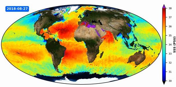 Animation of global sea surface salinity (SSS) over the period 04-04-2015 to 31-12-2018 based on the 8-day running mean version 4.2 SMAP Level 3 product from JPL.