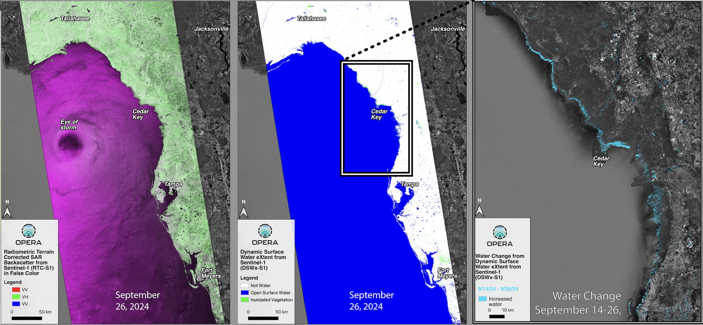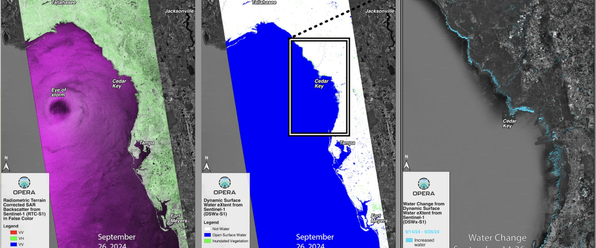 For the Hurricane Helene disaster response, the ARIA/OPERA team provided value-added radar and optical remote sensing datasets that were generated by the OPERA project. The team provided several disaster response datasets, including mosaicked OPERA Radiometric Terrain Corrected SAR backscatter from Sentinel-1 (RTC-S1) products (Figure 1, left), mosaicked OPERA Dynamic Surface Water eXtent from Sentinel-1 (DSWx-S1 data product) (Figure 1, center), and water change maps. Coastal inundation from the storm surge was mapped by differencing two DSWx-S1 images, one from September 14, 2024 before the storm and the other from September 26, 2024 after the storm (Figure 1, right). SAR-based water products have the key advantage of being able to ‘see’ water and the ground surface day or night and through cloud cover, which is particularly important during storms.