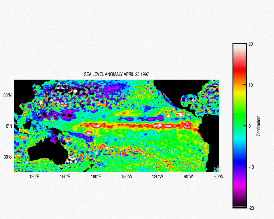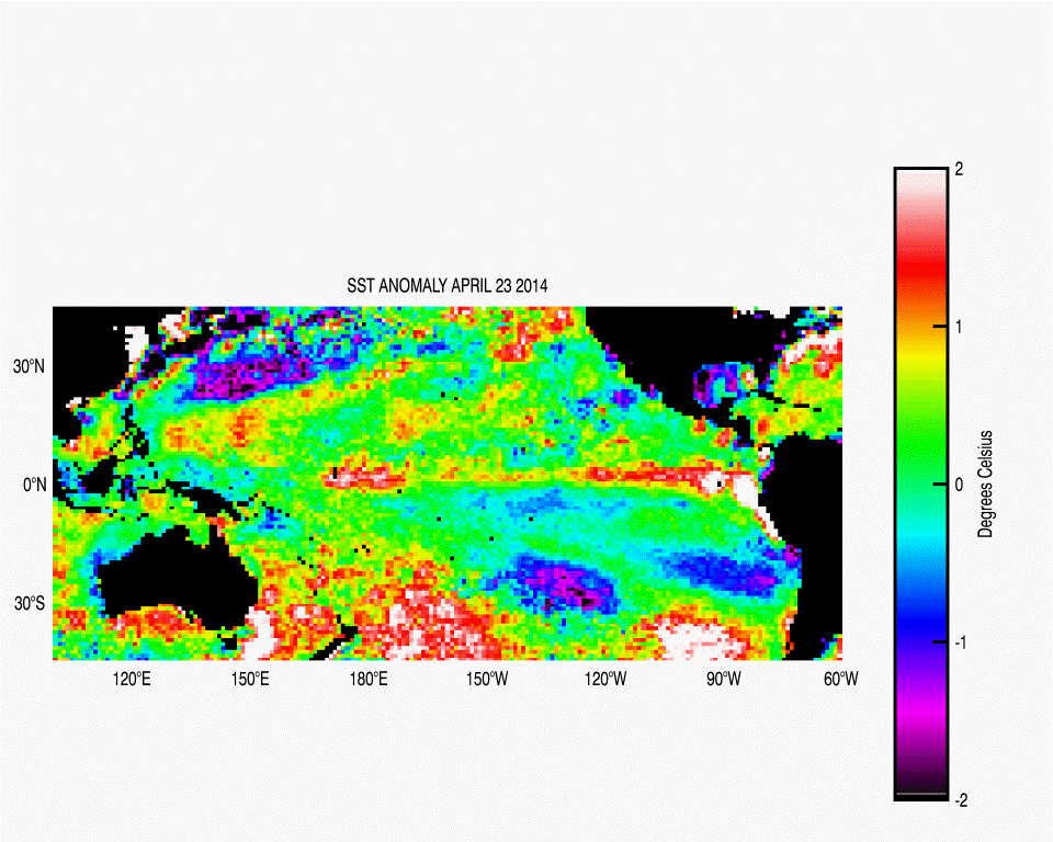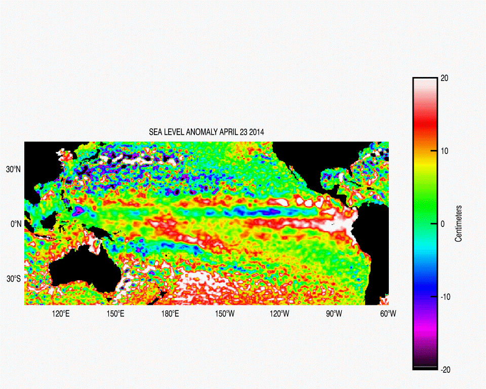 Figures 1 and 2 show a comparison of SST and sea level anomalies for similar periods of time in 1997 (preceding the large 1997-98 El Niño event), 2013 (considered a normal year), and 2014 (preceding a possible 2014-15 El Niño event). Anomalies are deviations from normal, wherein normal is a user-defined time average. SST anomalies are herein defined as the difference between total SST on April 23 of a respective year (1997, 2013, or 2014) to an average of SST on April 23 from 1985-2010. Sea level anomalies are sea surface heights computed with respect to a twenty-year mean. There are clear similarities between current conditions of the tropical Pacific and those preceding the 1997-98 El Niño. Similar to 1997 conditions, SST anomalies greater than 2°C are seen off the coast of South America in 2014, although the warming had not yet reached a maximum and did not extend as far west within the tropical Pacific (Figure 1). Similar patterns were also seen in sea level anomalies (Figure 2). Such similarities indicate that the observed 2014 conditions could be a precursor for a 2014-15 El Niño. If conditions continue towards an El Niño state it will peak near the end of the year, such as December 1997 for the 1997-98 El Niño event.