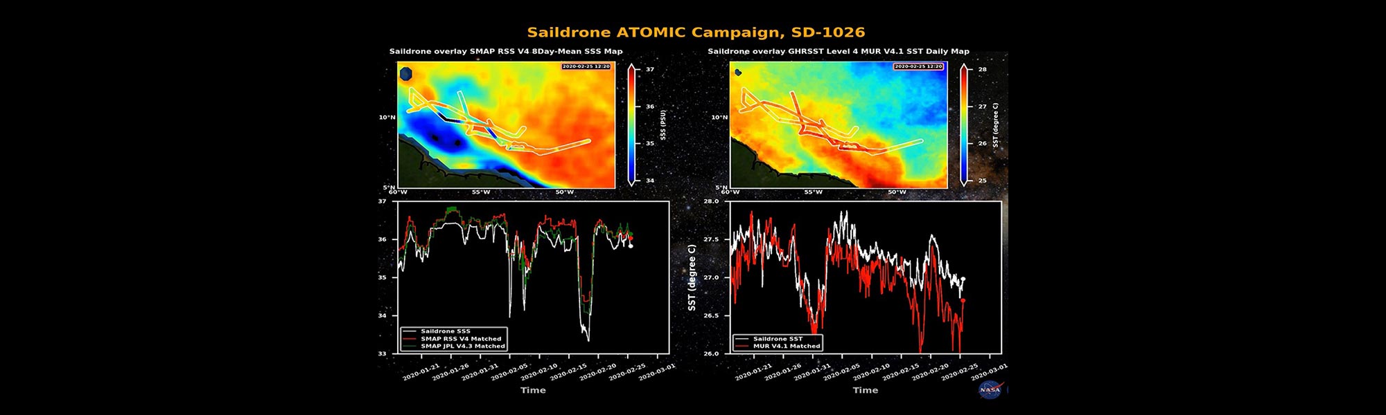Animations of the Saildrone ATOMIC field campaign along-track measurement data in relation to satellite SST and SSS observations (SD1026, SD1060, SD1061)