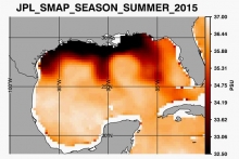 The JPL SMAP Version 4.0 datasets spans the full mission, with data available from 2 April 2015 to present. Global coverage data products include an 8-day running mean as well as monthly averages. Level 2 swath data are also available as part of the product release. They are available with a latency of 3 days for the L2 dataset, and 8 days and 1 month for the respective L3 products. The spatial resolution of the SMAP sensor, approximately 40 km, allows for improved applications to coastal and regional studies.  The image shows the seasonal average surface salinity for the summer of 2015. Clearly visible is the freshwater plume that is...           |